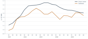 - Rates: Average sublease asking rates remain approximately $1.40 NNN.