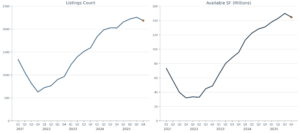 - Trend: Industrial availability remains elevated as new supply added over the past several years continues to exceed tenant absorption. Although new listings have slowed compared with peak levels seen earlier in the cycle, the total inventory level remains substantially higher than it was prior to 2021.