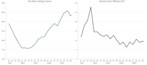 - For-Sale Supply: 1,598 listings totaling 63.8M SF.